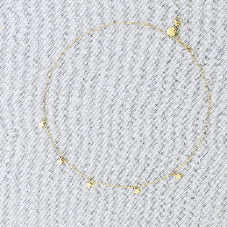 Gargantilla de acero, la cadena tiene una longitud de 43cm con tres posiciones tipo mosquetón. Tiene cinco colgantes en forma de estrella repartidas a lo largo de la cadena de 0,5cm cada una.